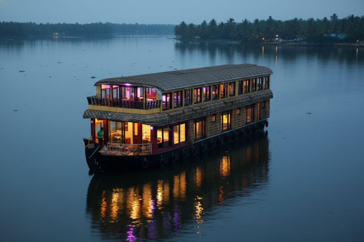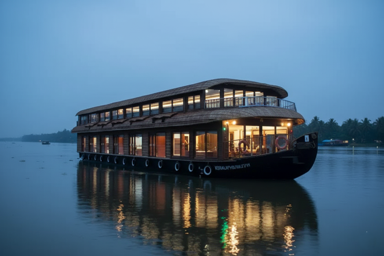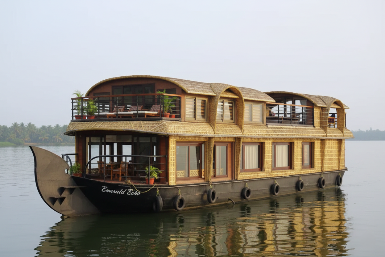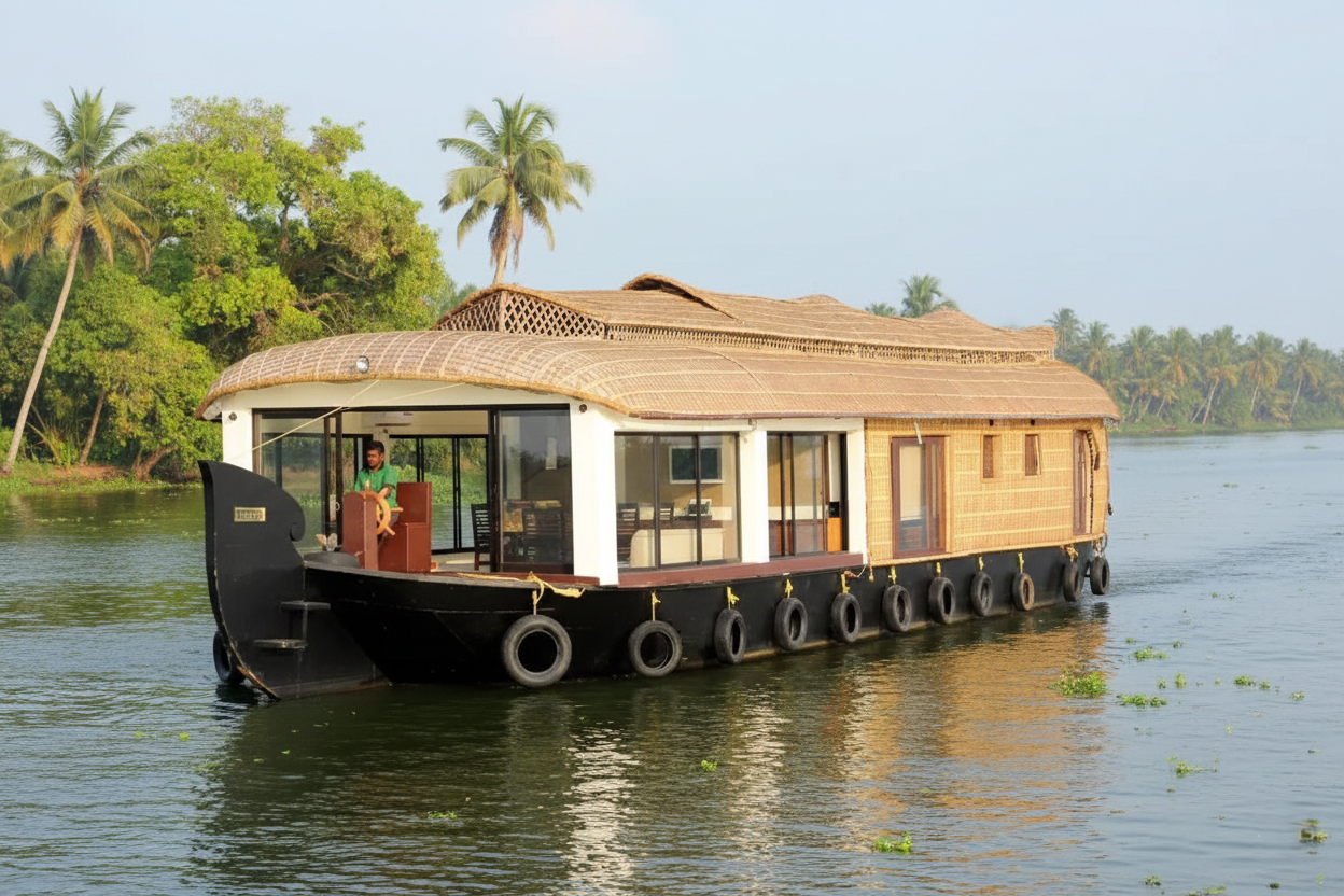 Exclusive three-bedroom super-luxury houseboat featuring opulent interiors and breathtaking backwater views.